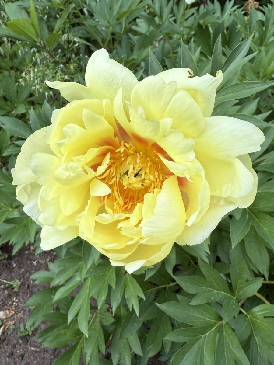 ‘Canary Brilliants’ est un cultivar fascinant pour les amateurs de nuances changeantes. Probablement l’une de mes Itoh préférées! Ses grandes fleurs semi-doubles s’ouvrent dans des tons jaune pêche ou abricot pâle, puis virent doucement au jaune crème rosé en fin de floraison. Ce jeu de couleurs donne un effet de bouquet mouvant sur un même plant. De port compact et arrondi, c’est une pivoine d’une grande élégance, à la fois douce et vibrante — parfaite pour ceux qui aiment les teintes chaudes et nuancées.